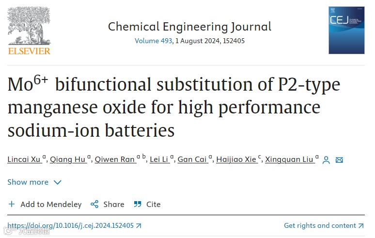 Mo6+双功能取代P2型锰基氧化物以获得高性能钠离子电池