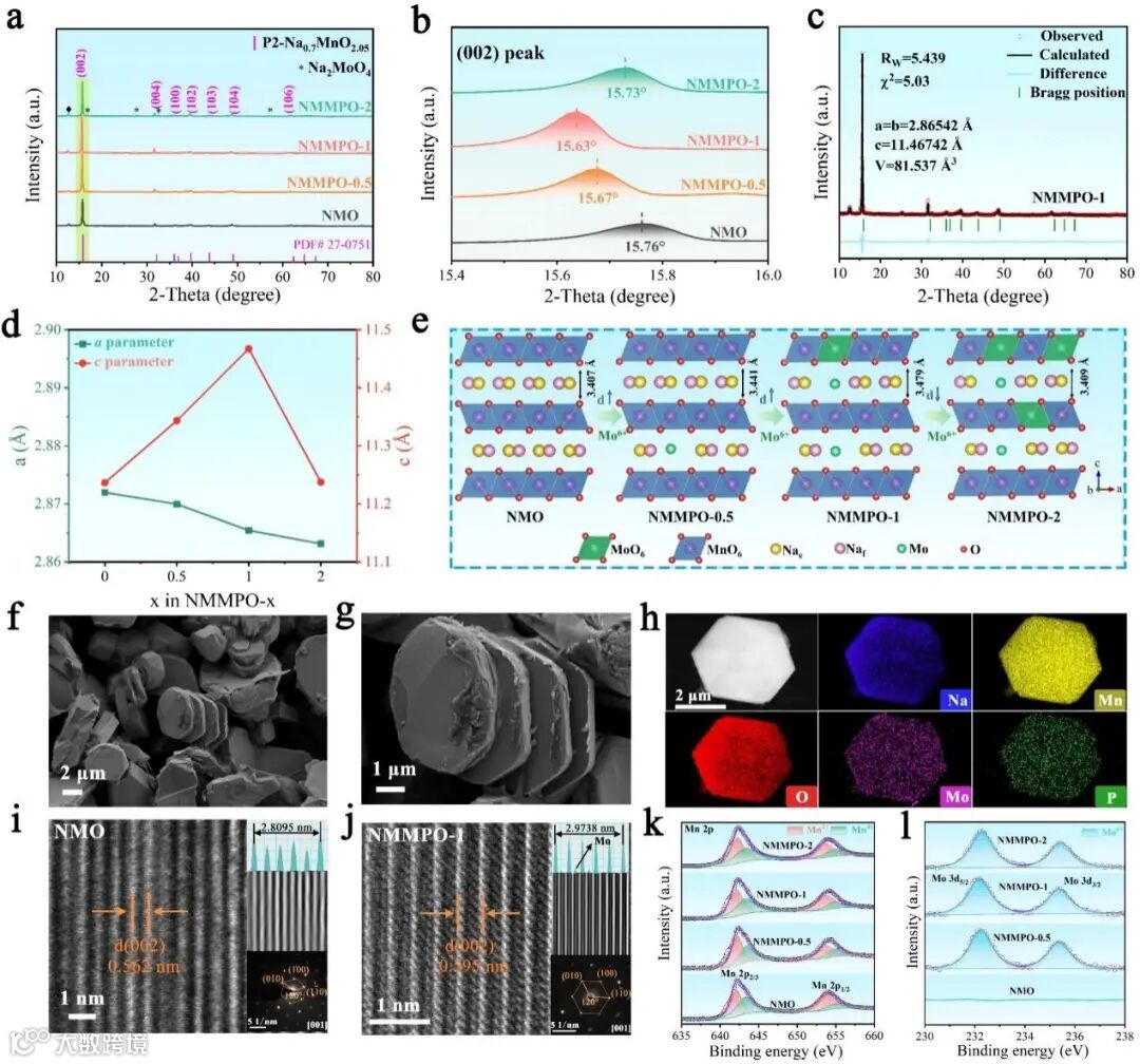 图1.(a)Na0.67Mn1-yMoO2-y/3(PO4)y/12(y=0、0.005、0.1和0.2)的XRD图谱;(b)(002)峰的放大图像;(c)NMMPO-1的XRD精修图谱; (d)P2相的晶格参数a和c随着Mo含量增加时的变化示意图;(e)Mo含量增加时的结构演变示意图;(f)NMMPO-1的SEM图像和(g)局部放大图像;(h)片状颗粒的EDS映射图;(i)NMO和(j)NMMPO-1的HRTEM图像和相应的SEAD图像;(k)Mn 2p和(l)Mo 3d在NMMPO-x中的XPS光谱。
