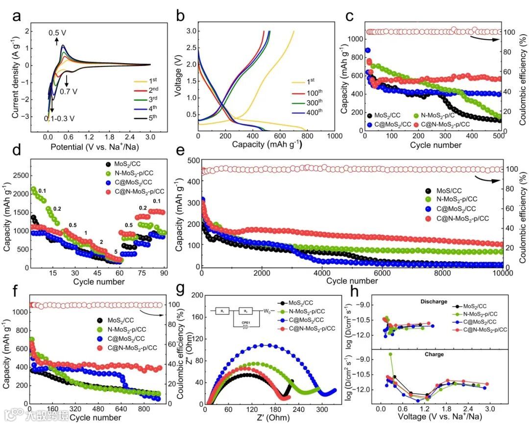 图2. (a)C@N-MoS2-p/CC电极在最初五个周期内以0.5 mV s-1的扫描速率进行的 CV 扫描;(b)1 A g-1下C@N-MoS2-p/CC电极的放电/充电曲线;(c)1 A g-1下的循环性能,右轴表示C@N-MoS2-p/CC的库仑效率;(d)所制备电极的倍率性能;(e)5.0 A g-1时的长期循环性能;(f)所制备电极在2.0 A g-1下的循环性能;(g)电极在1 A g-1下经过100次循环后的Nyquist图;(h)根据GITT测量值计算出MoS2负极的logDNa+值。