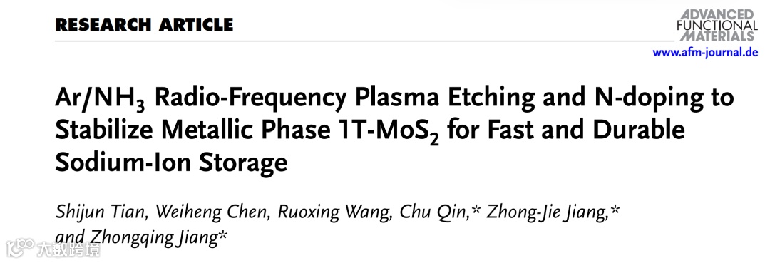 近日,来自浙江理工大学的蒋仲庆教授、秦楚博士与华南理工大学的蒋仲杰教授合作,在国际知名期刊Advanced Functional Materials上发表了题为“Ar/NH3 Radio-Frequency Plasma Etching and N-doping to Stabilize Metallic Phase 1T-MoS2for Fast and Durable Sodium-Ion Storage”的研究文章。该文章利用水热法和Ar/NH3射频等离子体处理技术,提出了在碳布上制备无粘结剂、氮掺杂和碳包覆的1T/2H混相MoS2纳米片(C@N-MoS2-p/CC)的合成策略,并用于高效、快速的钠离子存储。