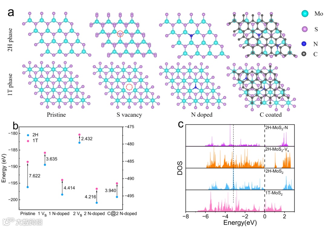 图3. (a)MoS2的DFT计算模型(原始、含硫空位、氮掺杂、氮掺杂和 碳包覆的2H和1T相);(b)这些结构对应的能量;(c)2H-MoS2-N、2H-MoS2-VS、2H-MoS2和1T-MoS2的总态密度。