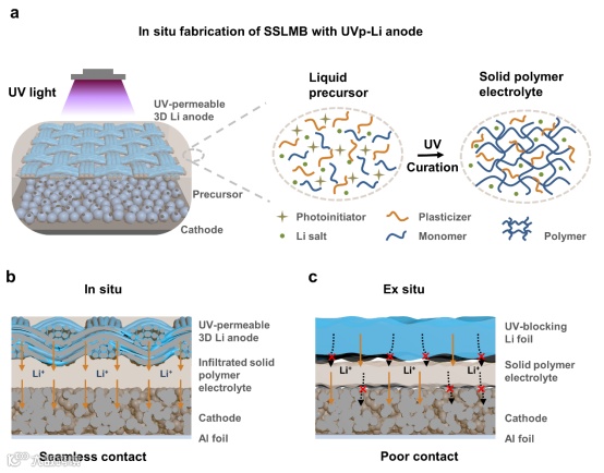 图1. 基于可透光3D复合锂金属负极的原位紫外光固化法制备固态锂金属电池。a. 原位紫外光固化制备固态锂金属电池机理。b. 基于原位方法制备的固态锂金属电池具有良好界面接触和离子传输。c. 基于非原位方法制备的固态锂金属电池界面接触和离子传输性能较差。