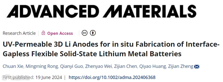 近日,来自香港李理工大学的郑子剑教授团队,在国际知名期刊Advanced Materials上发表题为“UV-Permeable 3D Li Anodes for in situ Fabrication of Interface-Gapless Flexible Solid-State Lithium Metal Batteries”的研究论文。该文章设计了一种可透光3D复合锂金属负极并应用于原位紫外光固化法制备聚合物固态锂金属电池,用以解决固态电解质与电极间的界面接触和锂金属负极循环稳定性问题。