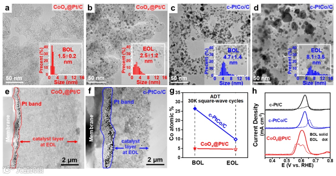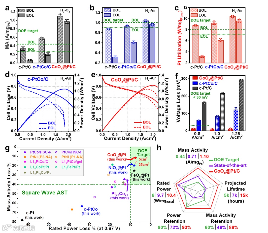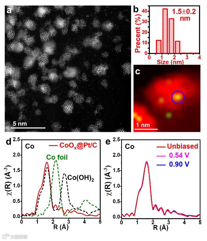 有鉴于此,近日,Nature Catalysis期刊报道了设计和合成了一种由分散的金属氧化物团簇内核稳定的超细小铂系纳米催化剂(CoOx@Pt, 见图1)。由于金属氧化物团簇(CoOx)高度分散于Pt这种设计充分利用了金属-金属氧化物强相互作用,在提高铂系催化剂活性的同时提高了表面铂原子稳定性(图1b)。同时,由于金属氧化物团簇被铂原子壳完全保护,解决了金属氧化物在燃料电池工作环境下导电性与稳定性差的问题。通过高分辨率扫描透射电子显微镜(STEM),电子能量损失光谱(EELS),和X射线吸收光谱等表征手段相互结合,证明了金属氧化物在Pt纳米颗粒中呈高度分散的团簇结构(图2)。燃料电池器件的性能表征发现由CoOx@Pt制备的MEA表现出高质量活性(1.10 A/mgPGM)和额定功率密度(1.04 W/cm2)。更重要的是,由于催化剂结构的高度稳定,制备的MEA表现出卓越的耐久性。