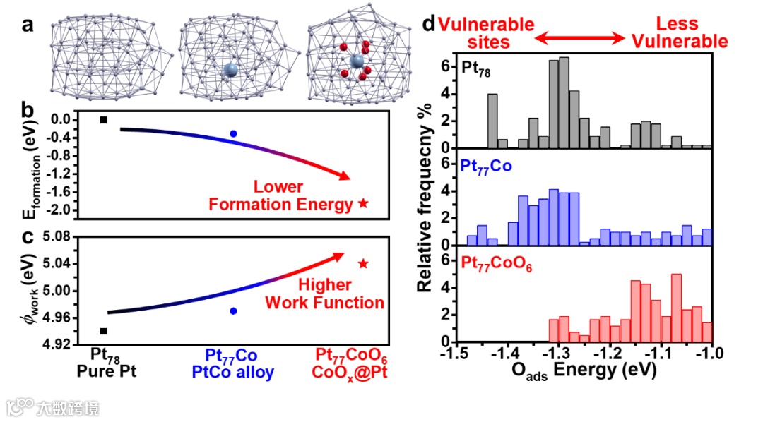 在30,000圈的加速老化测试后,质量活性保留率为88.2%,在0.8A/cm2的电压降仅为13.3mV,额定功率密度损失仅为7.5%,远超相关DOE性能目标(图3)。通过表征稳定性测试后催化剂粒径分布,MEA横截面中沉积在质子交换膜中的Pt比例,以及稳定性前后非铂金属的原子分数变化,结果证实了CoOx@Pt在燃料电池运行环境下的的高结构稳定性(图4)。理论计算结果发现,氧化物团簇内核铂基结构具有更高的热力学和动力学稳定性,其表面不稳定铂原子的比例相较于纯铂和铂合金结构更低,这解释了实验观测到的高性能稳定性(图5)。