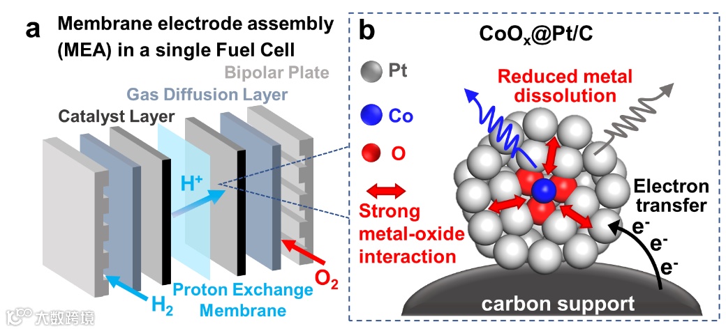 图1. 燃料电池结构图和CoOx@Pt 结构图。