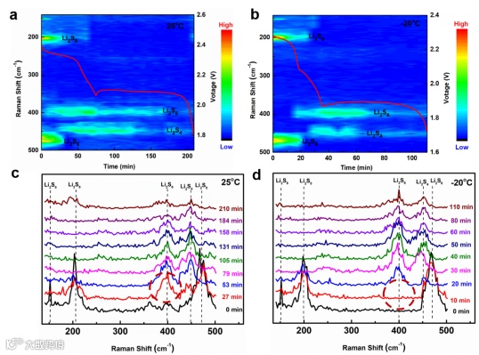利用原位拉曼来测试锂硫电池室温和低温下的放电反应。在室温下,Li2S8的信号首先出现,随后Li2S6和Li2S4的信号很快被发现,这表明在硫还原反应的第一阶段,Li2S8/Li2S6/Li2S4长期共存。室温下的快速液相转化反应使得整个过程中多个多硫化物同时还原。然而在低温下锂硫电池的第一个电压平台上,只能检测到Li2S8的特征峰,并没有没有Li2S6和Li2S4出现。而Li2S6和Li2S4是出现在低温下新的放电平台中,说明S8到Li2S4的低温转化过程分为两个步骤:S8还原为Li2S8,然后Li2S8还原为Li2S4。