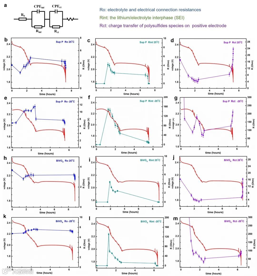 在对BiVO4/S电极的原位EIS表征中发现,由于其对多硫化物具有较强的吸附能力和催化能力,电解质中可溶的多硫化物由于快速转化而大大减少。无论在室温还是低温下,Ro都没有随着反应的进行而显著增加。BiVO4/S在低温下的Rct在各个阶段都比Sup P/S低得多。更重要的是,代表Li2S8到Li2S4过程的第二阶段的Rct没有像Sup P电池那样显著上升。这表明BiVO4对低温下锂硫电池的决速步骤有针对性的催化作用。