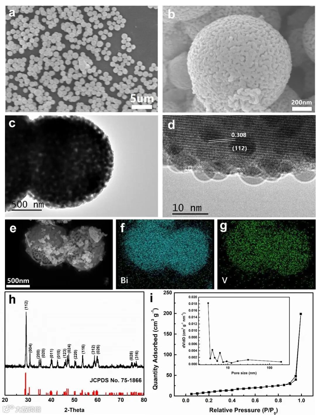 图2. 钒酸铋微球的形貌表征。
