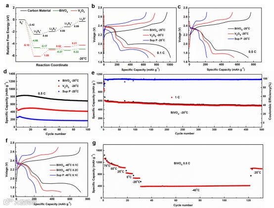 在-20℃时,DFT计算结果显示,BiVO4上Li2S8到Li2S4(低温下新出现的硫放电反应决速步)反应的吉布斯自由能为-0.17 eV,而V2O5上的吉布斯自由能高达1.09 eV,说明BiVO4对多硫化物转化的催化效果更优,尽管V2O5在S8到Li2S8这个低温下的非决速步骤的反应倾向最大(-6.1 eV)。这表明BiVO4作为低温锂硫电池正极改性材料具有广阔的应用前景。在温度为-20℃,电流密度为0.5 C时,普通碳材料为骨架的锂硫电池已经无法正常工作,固相反应已经无法进行。BiVO4/S电池在循环100圈后释放出了686 mAh g-1的容量,而V2O5/S和Sup P/S的仅为415 mAh g-1和168 mAh g-1。BiVO4/S在1 C下循环500圈后,容量依然保持在500 mAh g-1以上。甚至在-40℃的超低温度下,在0.1C电流密度下仍然可以释放出732 mAh g-1的容量。
