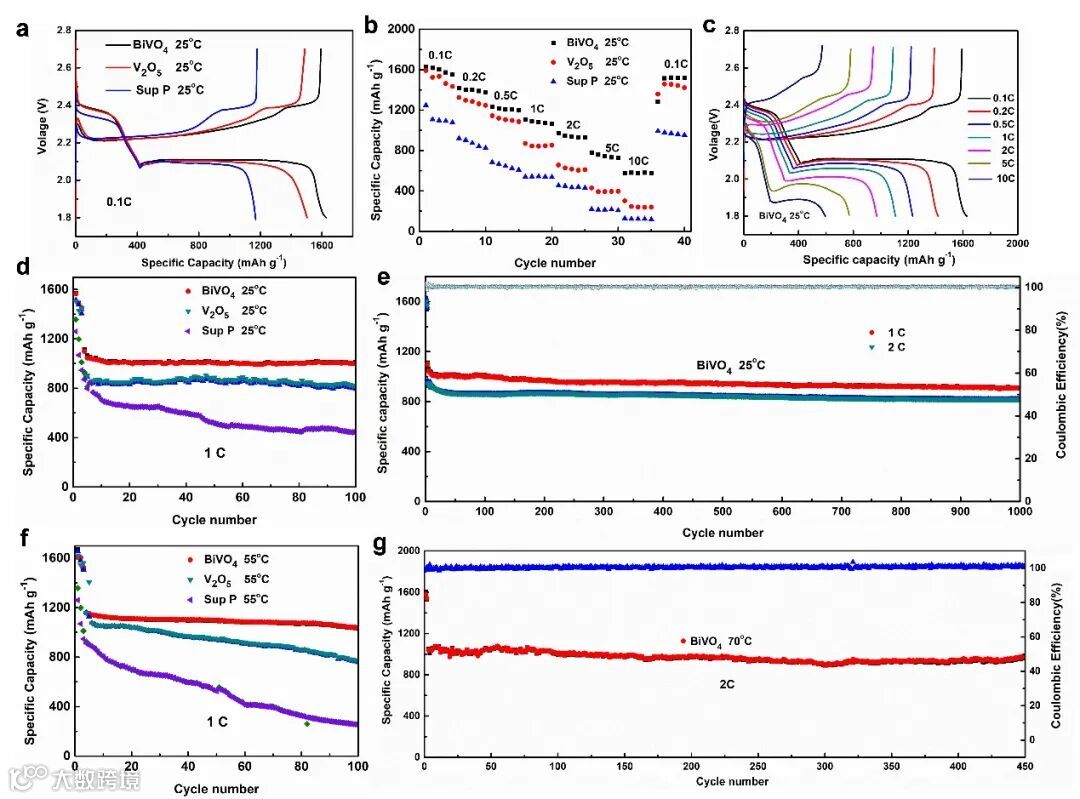随着温度的升高,锂硫电池中硫转化反应加快,在一定程度上提高了活性硫的利用率。然而,高温也会引起多硫化物的溶解度和溶解速度会急剧增加,导致“穿梭效应”恶化,循环寿命突然缩短。在55℃下循环100圈后,Sup P/S电池的容量迅速从925 mAh g-1 下降至 255 mAh g-1。而具有强吸附能力的V2O5/S电池的容量衰减也高达34.7%。这表明仅对多硫化物进行强吸附并不能保证其在高温下具有较高的电化学性能。由于BiVO4对多硫化物具有较强的吸附能力,并且对硫转化反应的定速步骤具有针对性的催化能力,从而实现了多硫化物的顺利捕获和转化步骤,循环100圈后,电池容量依然保持在1038 mAh g-1。甚至温度继续升高至70℃后,BiVO4/S电池在2C的大电流密度放电下循环450圈后,容量保持在970 mAh g-1,容量衰减率仅为0.016%每圈。BiVO4/S电极可以满足大多数便携式产品,电动汽车或混合动力汽车的高温要求。这种放电容量和循环稳定性在目前的锂硫电池研究中是非常罕见的。