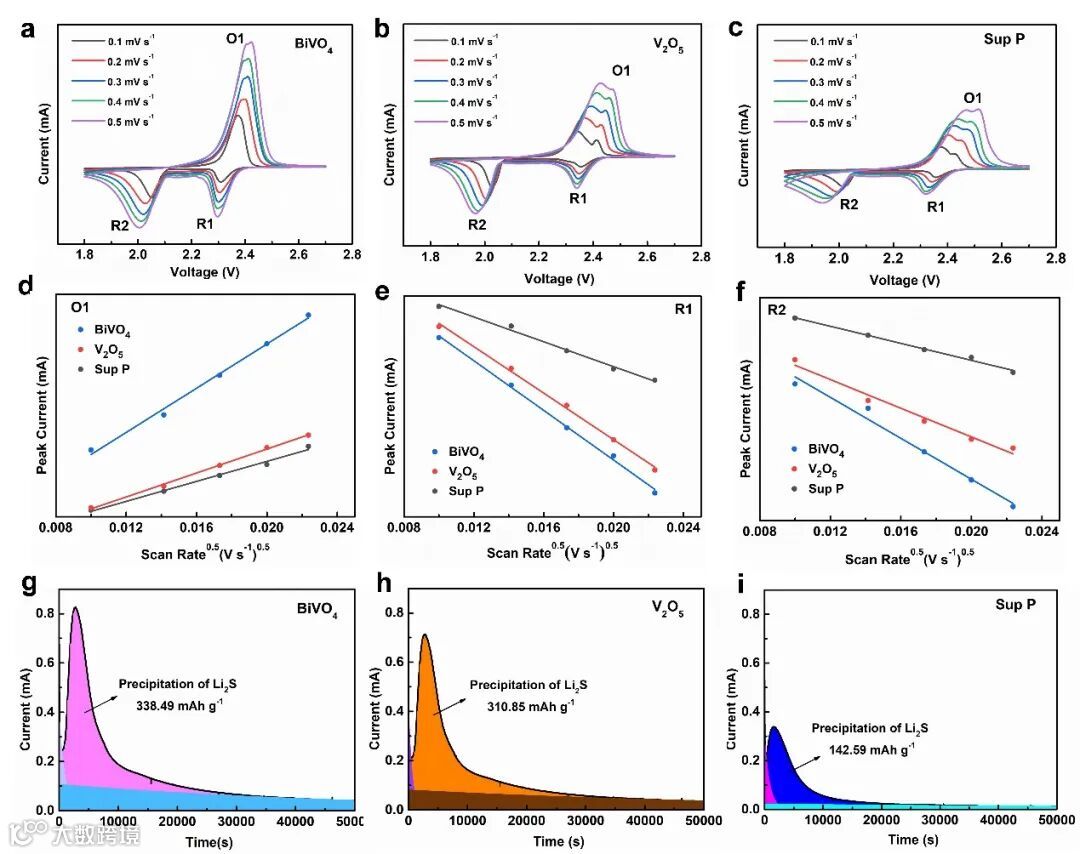 并且通过CV曲线计算出的离子迁移数也表明了同样的观点。尤其是在第二个表示固相反应的还原峰,钒酸铋电极的斜率要远高于氧化钒电极,这说明钒酸铋材料对锂硫电池室温下的反应决速步骤有特异性的催化能力。电池的硫化锂沉积实验结果发现,钒酸铋、氧化钒和Sup P的沉积容量分别为338.5 mAh g-1、310.8 mAh g-1和142.6 mAh g-1,这也很好的验证了上述结论。