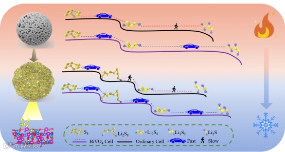图1. 钒酸铋微球提升宽温域锂硫电池性能示意图。