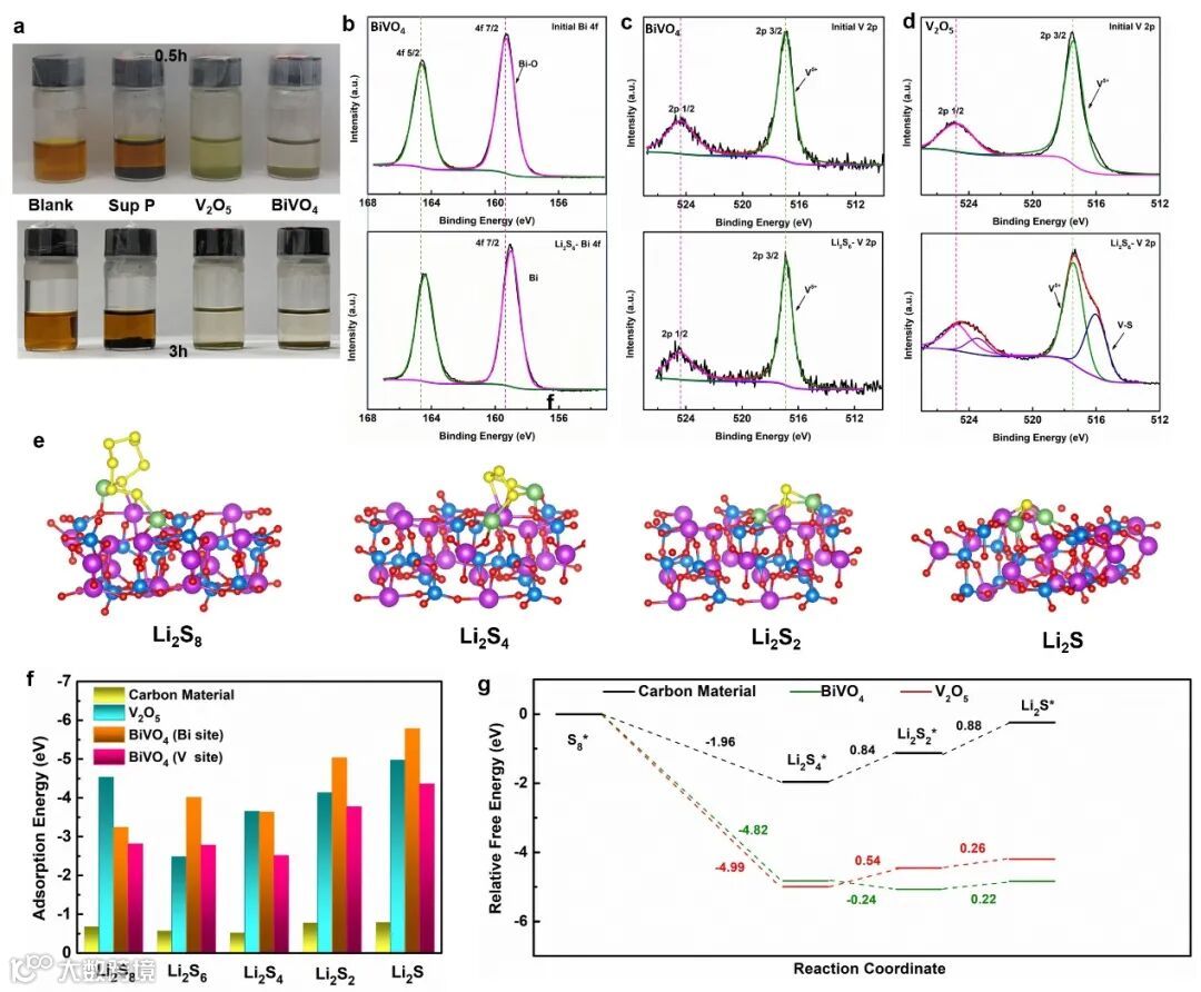 图3.多孔钒酸铋微球对多硫化物的吸附催化性能分析。