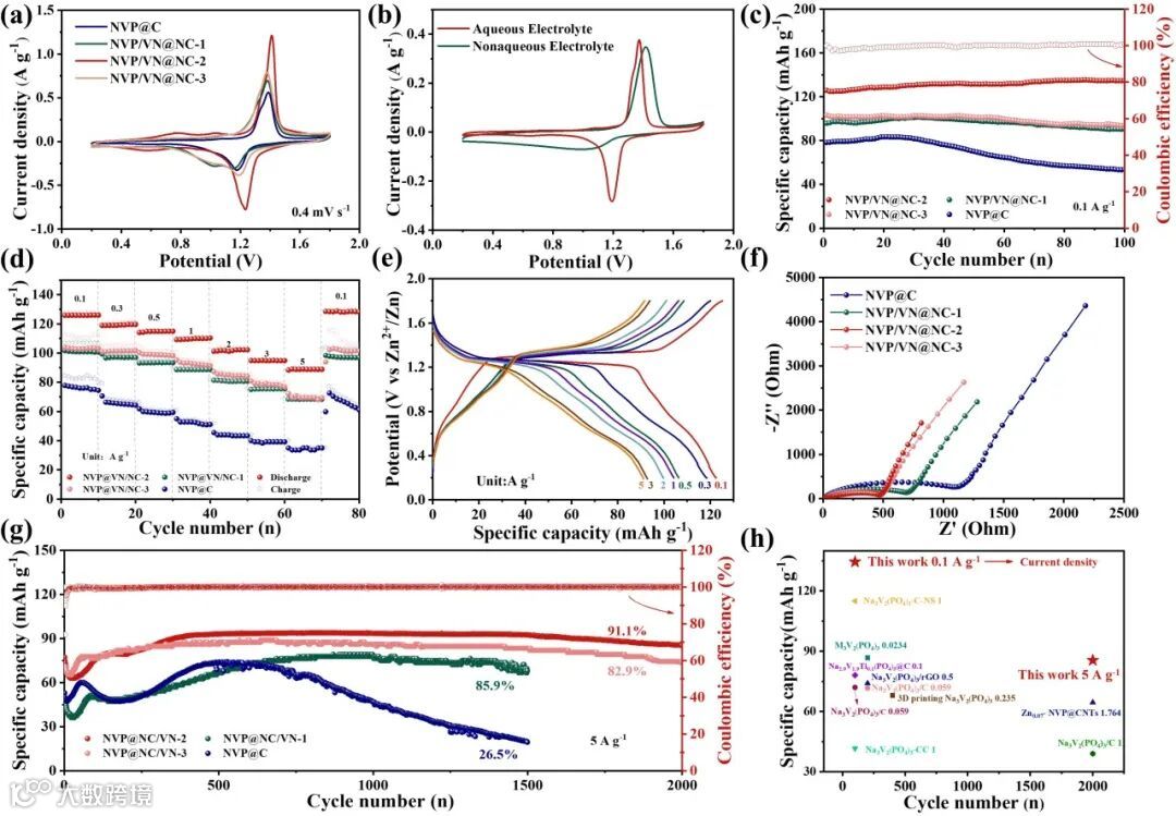 (a)0.4 mV s-1时的CV曲线;(b)NVP/VN@NC-2在水溶液和乙腈电解质中的CV曲线;(c)0.1 A g-1时的循环性能;(d)倍率性能;(e)不同电流密度下的GCD曲线;(f)阻抗图;(g)5 A g-1下的循环稳定性;(h)NVP/VN@NC-2与报道中NVP基的电极的ZIBs性能比较。