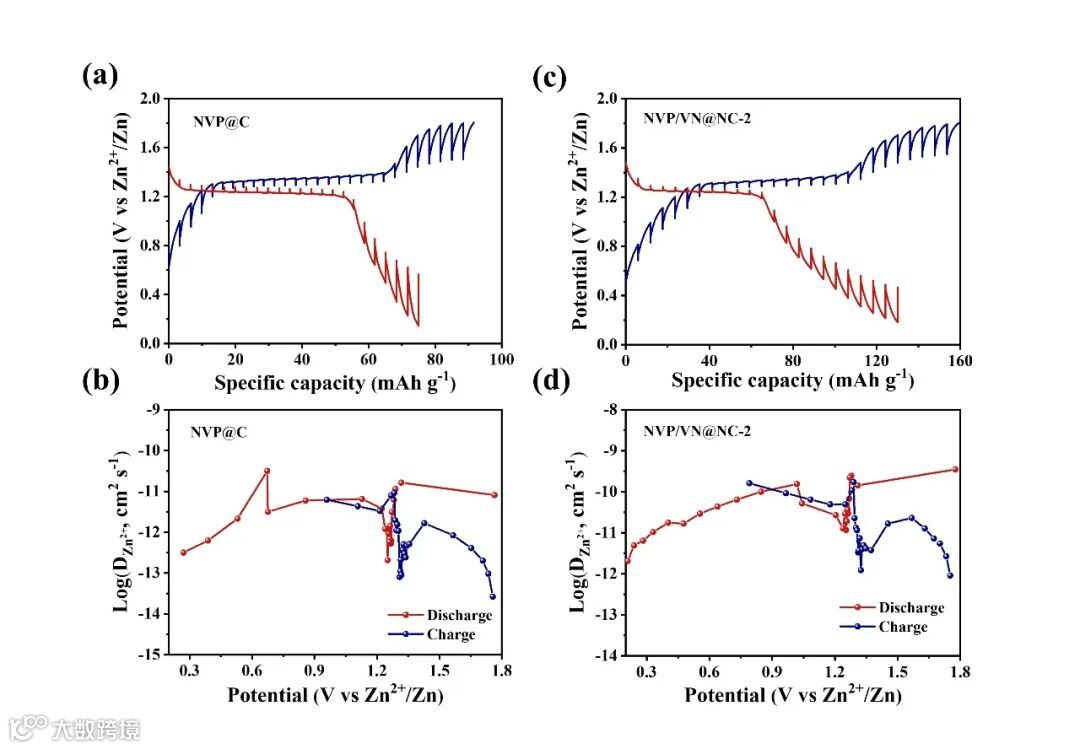 通过恒电流间歇滴定(GITT)测试得到锌离子扩散系数进一步分析反应动力学,通过一系列改性,结果表明:NVP/VN@NC-2的锌离子扩散系数远高于NVP@C。