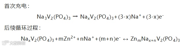 为了阐明电荷存储机制,根据首三圈的CV曲线(图S8c)可以明确离子嵌入机制。在首次充电过程中,NVP/VN@NC-2在1.39 V处仅出现单个氧化峰,对应于Na+的脱出。在随后放电过程中,出现了两个还原峰,分别为1.28 V和1.05 V,可归因为Na+和Zn2+的嵌入。之后的循环中,在~1.37/1.39 V和~1.05/1.28 V处观察到两对可逆的还原/氧化峰,分别对应于Na+和Zn2+离子的脱出和嵌入,这一结果直接证实了Zn2+/Na+共嵌入/脱出储能机制。NVP/VN@NC-2在2.5 M三氟甲磺酸锌溶液中进行了测试,并立即通过XRD和RAMAN非原位表征对电荷储存机制进行进一步验证。最终总结如下:在初始电荷状态下,部分Na+从Na3V2(PO4)3晶格中的Na2位置脱出,而剩余的Na+由于Na1不活跃而留在框架中,形成NaxV2(PO4)3相。随后的Zn2+/Na+共嵌入形成了ZnmNax+nV2(PO4)3,具体示意图如图7d。化学方程式如下: