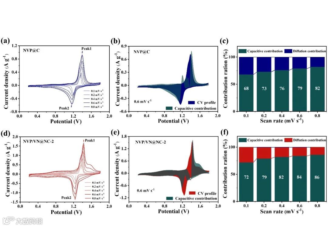 (a)NVP@C和(d)NVP/VN@NC-2的多扫速CV曲线;(b)NVP@C和(e)NVP/VN@NC-2的b值图;(c)NVP@C和(f)NVP/VN@NC-2的电容贡献率。