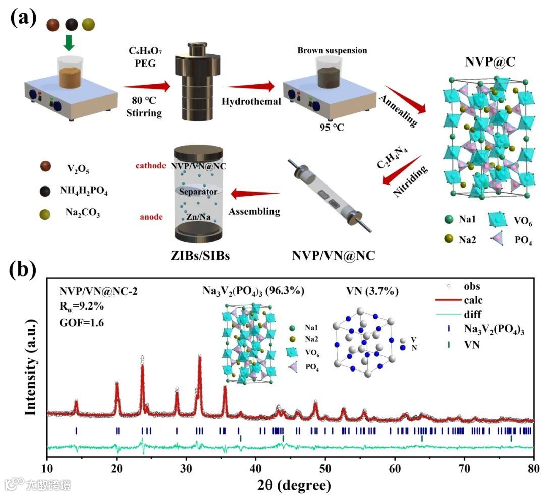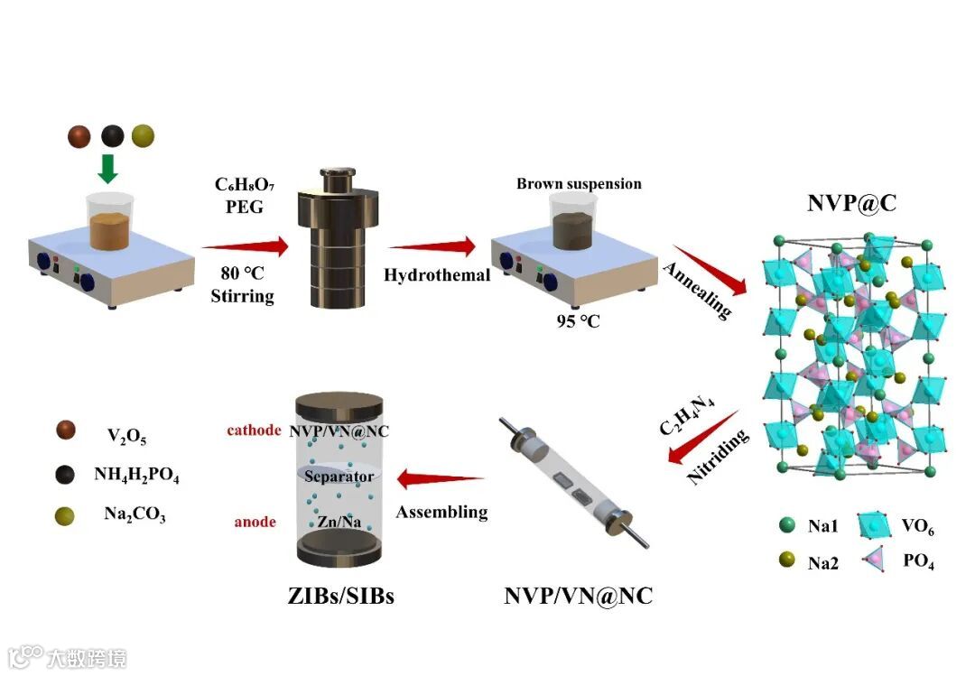 首先,通过水热辅助溶液-凝胶法,再通过在H2/Ar中煅烧干凝胶前驱体,生成具有碳包覆层的原始相NVP@C。接着,以NVP@C为钒源,C2H4N4为氮源,通过原位氮化生成VN量子点,同时形成氮掺杂碳层,构建了NVP/VN@NC异质结构。