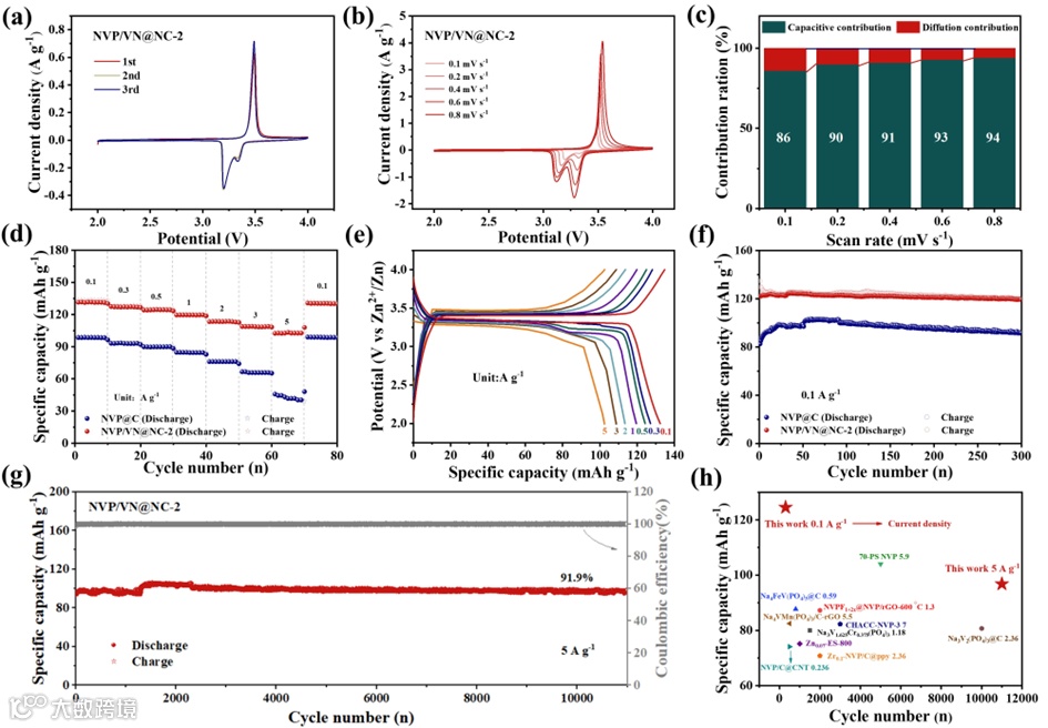 (a)0.1 mV s-1时的CV曲线;(b)不同扫描速率下的电化学行为;(c)扩散和电容贡献比;(d)倍率性能;(e)不同电流密度下的GCD曲线;(f)0.1 A g-1时的循环性能;(g)5 A g-1时的循环性能; (h) NVP/VN@NC-2与报道中NVP基的电极的SIBs性能比较。