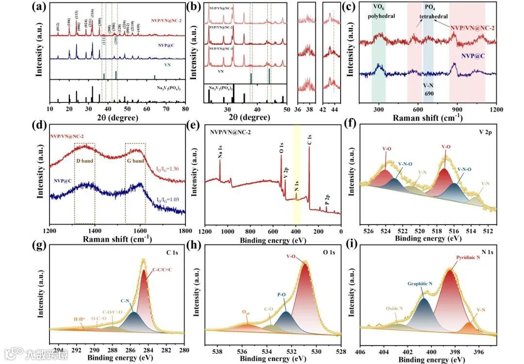在图3a-b中,通过对XRD谱图分析可以证明VN的存在,且氮化时间越长,VN生成量越大。拉曼谱图(图3c-d)可以证明VN的存在,同时,可以通过拉曼谱图中ID/IG比值,评估电极材料的无序度。计算得出NVP@C的ID/IG值为1.03,表明碳包覆层的部分石墨化。与NVP@C相比,NVP/VN@NC-2的ID/IG值高达1.36,这主要因为氮化后形成了掺杂氮的碳层并诱发了表面缺陷。如图3e-f所示,存在V、N、C、Na、P和O等元素,且对元素组成和价态进行了具体分析。