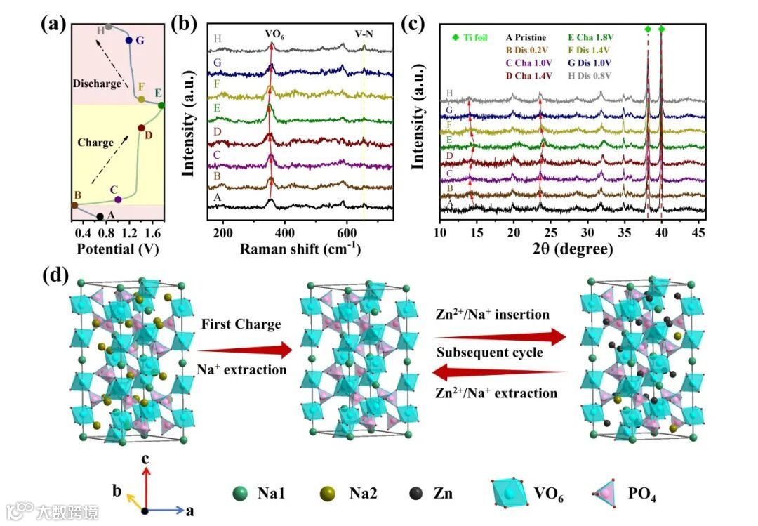 NVP/VN@NC-2的非原位测试:(a)充电-放电曲线;(b)拉曼光谱;(c)XRD图谱;(d)Zn2+/Na+共嵌入/脱出机制示意图。