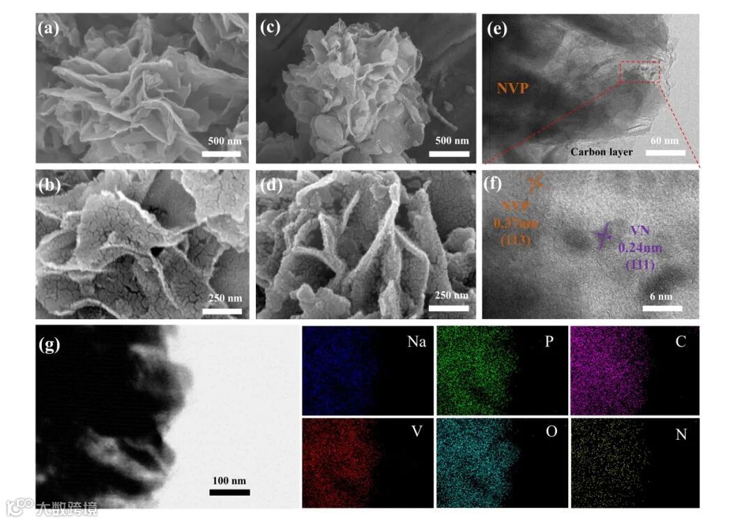 (a,b)NVP@C、(c,d)NVP/VN@NC-2的扫描电镜图;NVP/VN@NC-2的(e)透射电镜图,(f)HRTEM图和(g)EDS图。