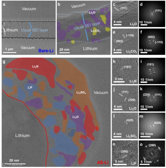 图4. SEI 的微观结构和成分的冷冻电镜分析结果。a-b)循环后Bare-Li SEI形态的Cryo-TEM 图像,a)为低放大倍率,b)为高放大倍率视图。c-d) Li2O和 e-f) Li2CO3晶体的 HRTEM 和快速傅里叶变换 (FFT) 结果。g)循环后 AS-Li SEI 成分和分布的Cryo-HRTEM 图像。h-i) Li3N ,j-k) Li2O,l-m) Li2SO4 和 n-o)LiF 晶体的 HRTEM 和 FFT 结果。