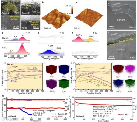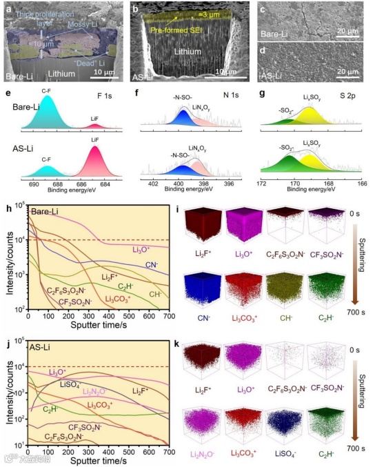 图3. 人工 SEI 与天然 SEI 在形貌、成分和纳米结构方面的比较。a)Bare-Li 和 b)AS-Li 在 1 mA cm−2@3 mAh cm−2 下循环 30 次后的横截面 FIB-SEM 图像。c) Bare-Li和 (d) AS-Li 的表面 SEM 图像。e–g) 在1 mA cm−2@3 mAh cm−2条件下循环30圈后Bare-Li和 AS-Li 表面的 e) F 1s、f) N 1s 和 g) S 2p 的 XPS 光谱。h–k) TOF-SIMS 结果,包括循环后Bare-Li 和 AS-Li 的 SEI 的 h、j) 深度剖面和 i、k) 3D 模型。