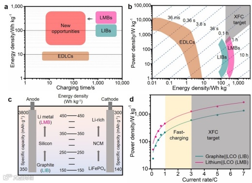 图1. 快充锂金属电池的优势:a) EDLCs、LIBs 和 LMBs 的能量密度和充电时间。b) 所涉及系统的功率密度与能量密度 Ragone 图。c) 基于不同正负极材料组合的 LIB 与LMB 的能量密度变化。d) 基于 LCO 正极的 LIBs 和 LMBs 的功率密度随电流速率的变化。