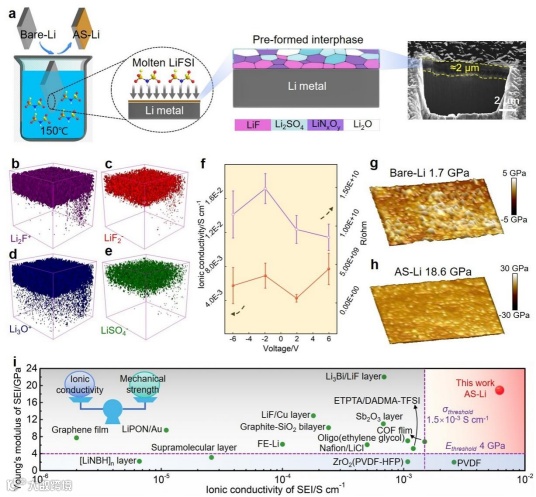 图2. 界面相结构和电化学-机械性能评估。a) AS-Li 界面相形成示意图。b–e) TOF-SIMS 测量的 AS-Li SEI 成分的 3D 模型。f) 使用 c-AFM 纳米电极装置在 AS-Li 上施加变化偏压获得的离子电导率和电阻图。g) 裸锂、 h) AS-Li 表面的平均杨氏模量。i) AS-Li 中形成的 SEI 的离子电导率和杨氏模量与文献数据对比图。