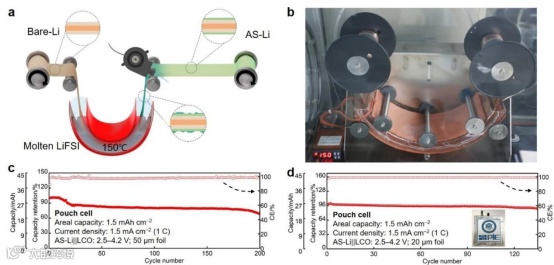 图6. 卷对卷生产演示和软包电池性能展示。a)卷对卷系统示意图和b)截面照片(整个系统放置在充满氩气的手套箱中)。分别使用c)50 μm 和d)20 μm Li 箔的 AS-Li||LCO 软包电池的循环性能。