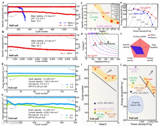图5. 半/全电池的电化学性能表征。a-b)Bare-Li||LFP 和 AS-Li||LFP 半电池在 a)10 C 和 (b) 50 C 下的循环性能。c)AS-Li||LFP 与 AS-Li||LFP 的高倍率循环性能比较。d)AS-Li||LFP 电池中 LFP 的容量、电压和能量密度。e)LFP 与 AS-Li 和 Bare-Li 配对的 Ragone 图(同时考虑了能量密度和功率密度)。f)AS-Li 和Bare-Li电池性能的雷达图。g-h)AS-Li||LiCoO2 (LCO)全电池在N/P比为 g) 2.5和 h) 6时的循环性能。i)基于AS-Li 的全电池的电化学性能与 2021 年以来文献报道的其他高倍率 LMB 全电池的对比。j)AS-Li 基全电池和同类型文献中各种负极基全电池的能量密度与功率密度关系图。