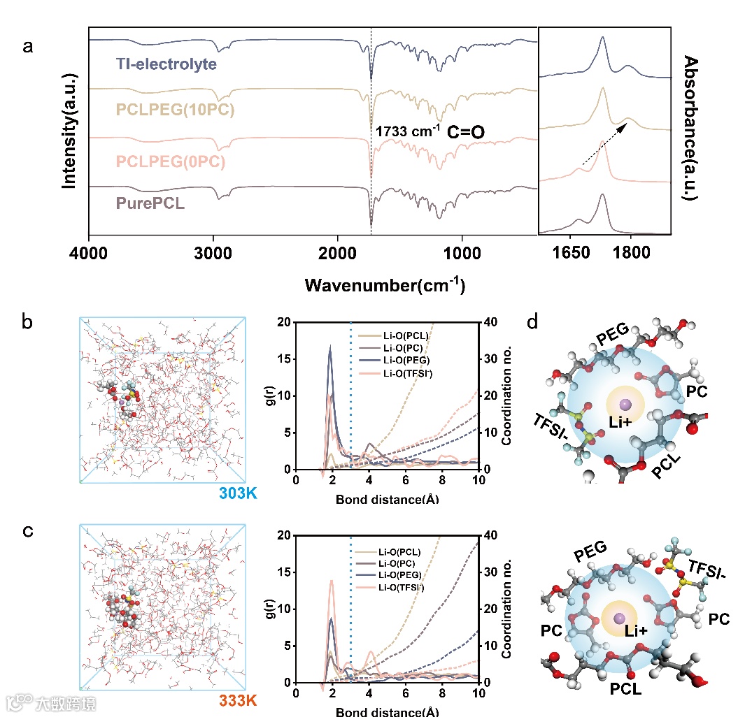 为了进一步研究PC和温度对TI-electrolyte中Li+传输机制和溶剂化结构的影响,本文进行了分子动力学(MD)模拟和傅里叶变换红外光谱(FT-IR)测试。结果显示,纯PCL在室温下Li-O(PCL)和Li-O(TFSI-)的配位数分别为2.05和1.48。相比之下,TI-electrolyte中Li-O(PCL)和Li-O(TFSI-)的配位数分别为2.20和0.61。此外,其中Li-O(PEG)和Li-O(PC)的配位数分别为1.20和1.79。结合FT-IR可以观察到,引入PC后,PC参与了Li+的配位,这通过碳酰基(C=O)吸收峰从1650 cm-1蓝移到1770 cm-1得到证实,表明PC中的碳酰基团参与了Li+的配位(C=O…Li+)。