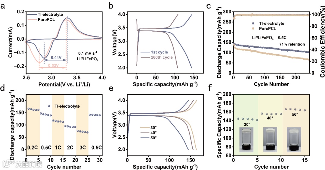 与纯PCL的电化学窗口(4.1V vs Li+/Li)相比,TI-electrolyte展现出更宽的电化学窗口,扩展到4.7V(vs Li+/Li),这表明其优异的电极稳定性,使其能够在相对较高的电压下保持稳定,适用于更严苛的使用条件。本文还测试了TI-electrolyte的Li+迁移数()并与纯PCL进行了比较。计算得出的TI-electrolyte的为0.61,高于纯PCL观察到的值0.51,这项提高可归因于引入PC与短链PEG,两者都促进了Li+的传输。得益于其出色的离子电导率和,用TI-electrolyte组装的锂对称电池在CCD测试中表现优秀,达到了1.5 mA cm-2的电流密度,其出色的电化学性能使电池能够在保持安全的同时高效运行。