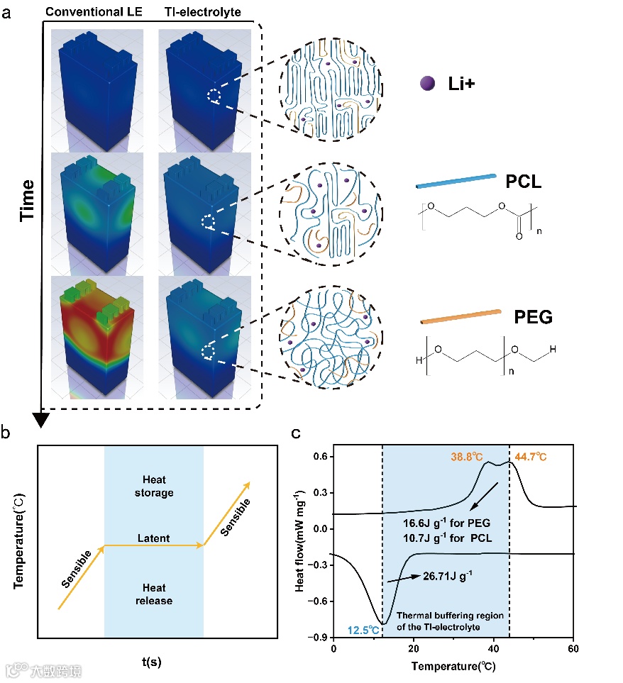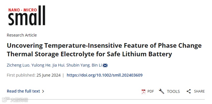 近日,北京航空航天大学的李彬副教授在国际知名期刊Small上发表题为“Uncovering Temperature-Insensitive Feature of Phase Change Thermal Storage Electrolyte for Safe Lithium Battery”的文章。该文章利用相变材料聚己内酯和聚乙二醇制备了一种温度不敏感电解质(TI-electrolyte),这种电解质具有出色的抗热刺激能力,可以解决由于缺乏耐热滥用性而导致的LIBs安全问题。