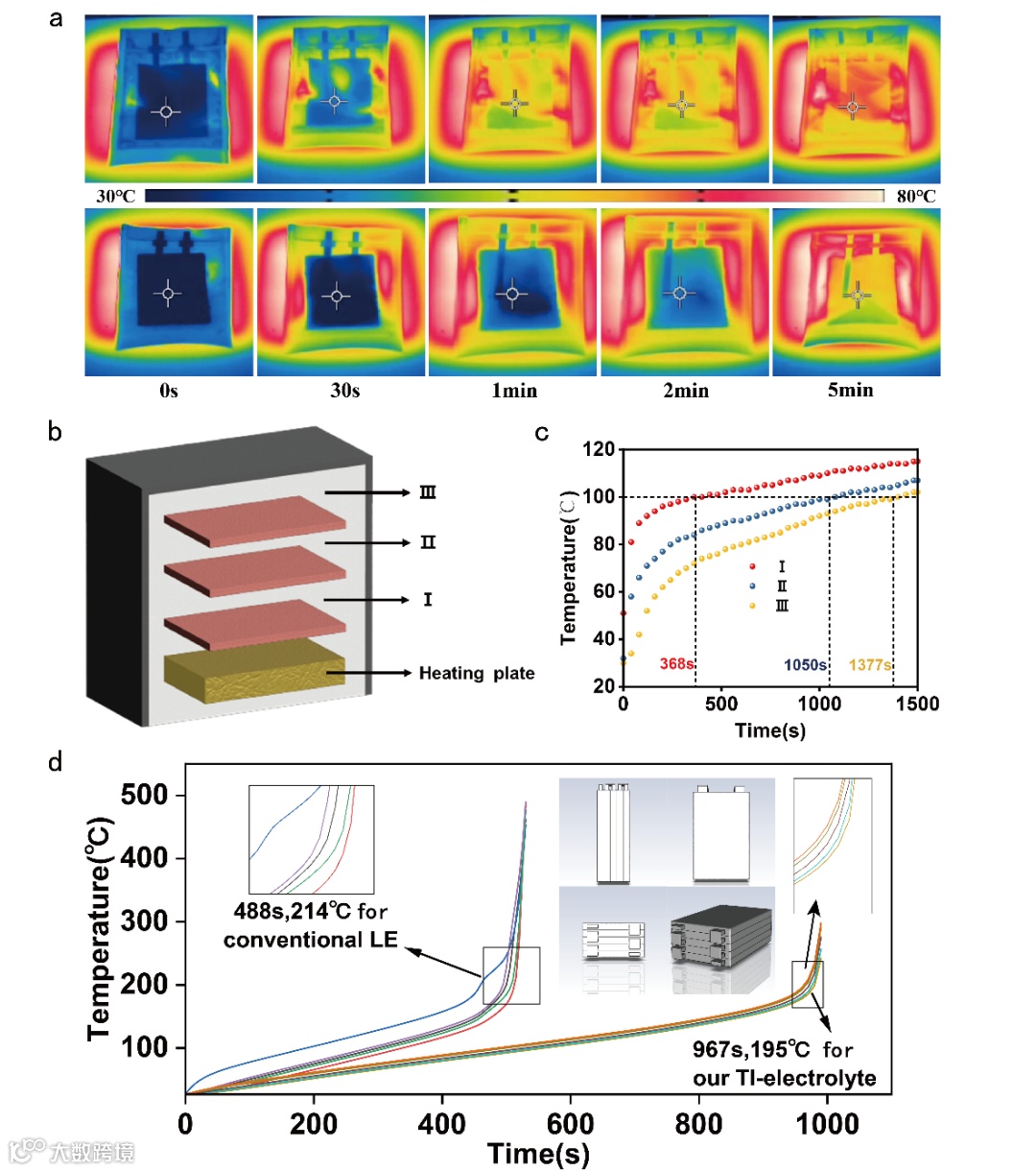 TI-electrolyte在加热时具有吸热效应,在冷却时具有放热效应,展现出显著的耐受突发性热或冷冲击的潜力,并能在滥用条件下迅速管理电池温度。为了验证其的热调节性能的实用性,组装了LFP软包电池,并准备了液体电解质(LE)软包电池进行比较。使用红外热像仪监测电池在热/冷冲击下的内部温度。如图,在0分钟时,两个电池的温度都在28°C左右,图像中主要显示为蓝色。在热冲击(热板温度约90°C)下,基于LE的电池温度增加的速度明显快于基于TI-electrolyte的电池。仅5分钟后,基于LE的电池的温度已接近热板温度。使用TI-electrolyte的电池在达到目标温度方面表现出明显的延迟,表明其具有出色的热调节性能,其有效地缓冲了电池在极端条件下的突然温度升高,使电池能够正常工作并增强其及时安全性。同时,本文使用Ansys Fluent的MSMD电池模块与NTGK电化学模型进行了热失控模拟。