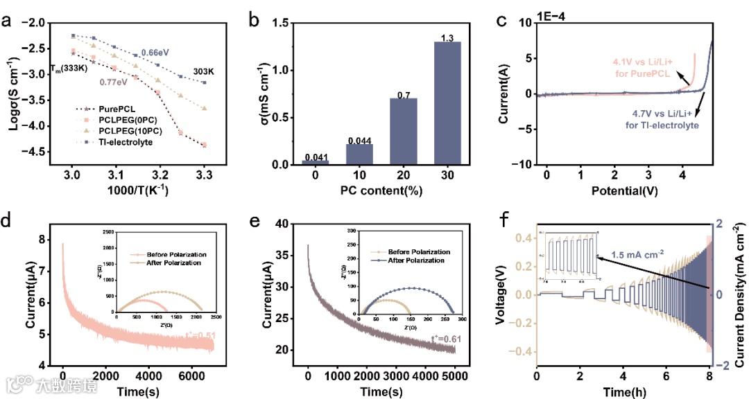 Li+迁移活化能(ΔEa)是评估电解质导离子性能的重要指标之一。通过比较PCL-PEG(0PC)、PCL-PEG(10PC)和PCL-PEG(20PC)的阿伦尼乌斯曲线,观察到引入PC显著提高了室温下电解质的离子电导率。这种增强可以归因于PC减少聚合物中的晶体区域的能力,而增加的无定形区域,促进了Li+传导。从图中确定PCL-PEG(0PC)的ΔEa为0.77 eV,而对于PCL-PEG(20PC)其值甚至更低,为0.66 eV。这与观察到的宽温度范围内高离子电导率一致。以纯PCL作为室温下离子电导率的参考,PCL-PEG(0PC)的离子电导率接近纯PCL。然而,PCL-PEG(10PC)的离子电导率增加了5.3倍,PCL-PEG(20PC)显示出显著的17倍增强,达到0.7 mS cm-1,满足了高性能锂离子电池的组装条件。LSV测试揭示了TI-electrolyte的电化学稳定性。