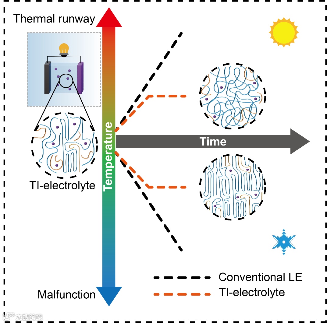 尽管锂离子电池(LIBs)被广泛应用,但偶尔发生的火灾和爆炸事件仍然困扰着锂电池的使用。这些安全风险是其进一步发展的不可忽视的障碍,且通常与电池的热管理有关,表现为快速的热失控(TR)。在复杂且变化多端的使用环境中,尤其是在面对快速温度变化的条件时,电池的TR更容易发生。除了不受控制的外部热量,电池内部也会因许多放热的副反应而迅速释放热量。另一方面,当电池经历突然冷却过程时,电池的整体性能也会迅速下降,负极上的锂枝晶生长也可能发生,这也会带来电池的不可逆故障。从这个角度来看,电池的热管理,特别是提高对温度变化的耐受性,在电池的安全性和性能中起着重要作用。因此,亟需开发一种用于锂离子电池的温度不敏感电解质。