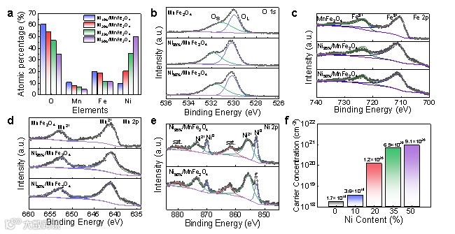 图2. 通过改变表面Ni含量,有效调控了MnFe2O4的费米能级位置,实现了不同程度的能带弯曲和电子相互作用。