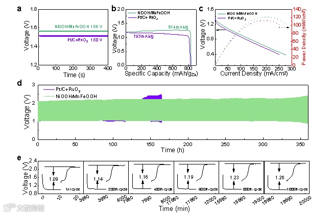 图6. 基于NiOOH/MnFeOOH阴极的ZAB表现出1.56 V的高开路电位(OCP)和超过1000次循环的优异稳定性。