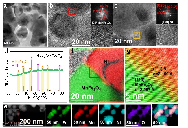图1. 通过利用TEM, HRTEM, XRD, EELS等分析表征手段,催化剂中具有Ni和MnFe2O4双相结构并多处形成了Ni/MnFe2O4异质结。