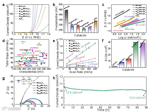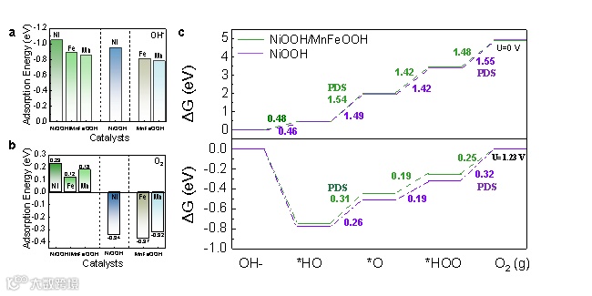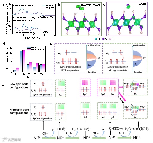 图5. DFT证实NiOOH/MnFeOOH调控了含氧基团的吸收能,及催化反应过程中的PDS能垒,这归因于Ni活性位点和氧中间体自旋态的调控,优化了反应动力学。