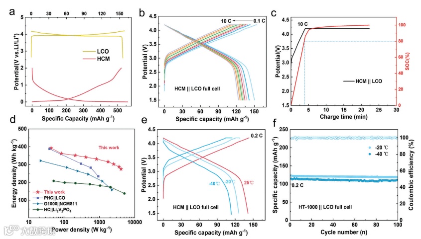 对HCM的储锂性能进行测试,发现HCM具有537 mAh g-1的高可逆比容量、出色的平台容量占比(55%)、优异的倍率性能(10 A g-1下为152 mAh g−1)。通过HCM||LCO全电池的测试表明,得益于HCM拥有的长平台容量占比,HCM||LCO全电池可提供393 Wh kg-1的高能量密度和出色的低温性能,使得其在实际应用中具有很好的前景。