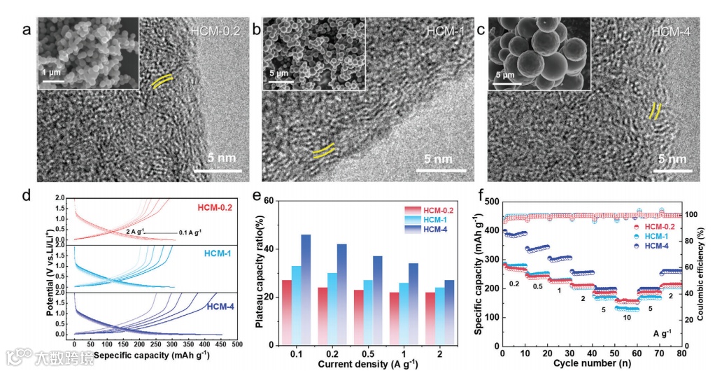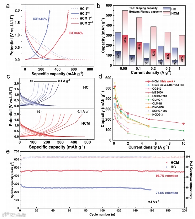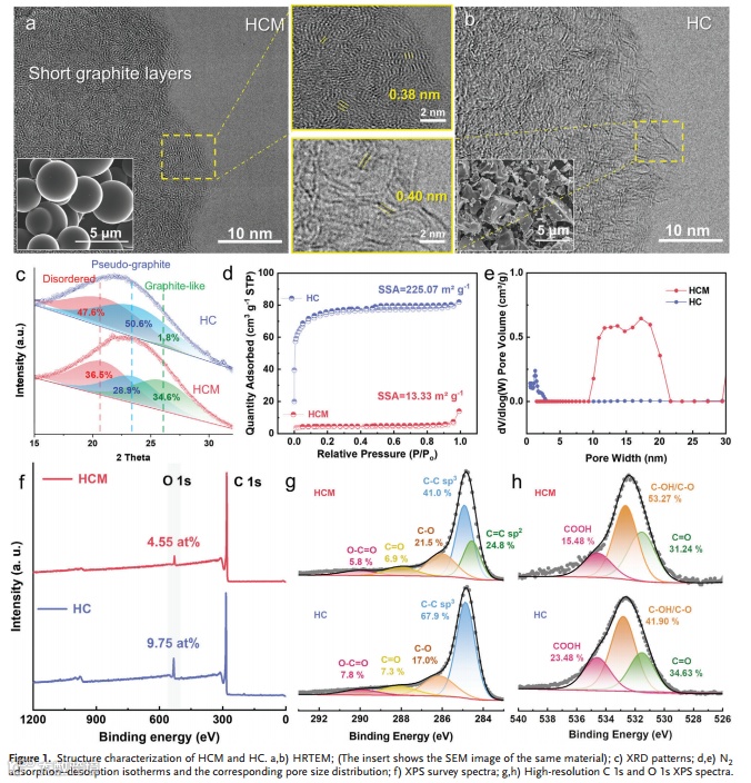 硬碳微球(HCM)是通过果胶先水热预处理,然后高温碳化法制备。相比之下,直接碳化的样品,记为HC。通过XRD、SEM和TEM等表征可以看出HCM具有适当的石墨微晶,适度的缺陷含量和降低的比表面积。