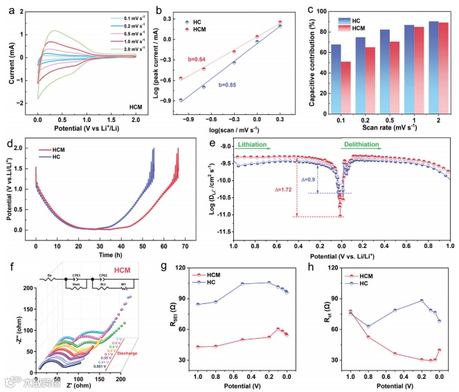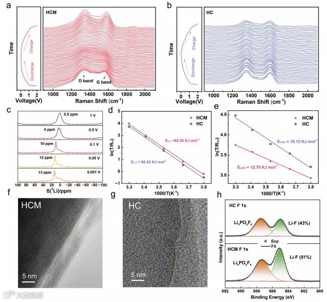 为了进一步研究锂离子在所制备硬碳电极材料中的电化学动力学行为和储锂机理,不同扫速CV和GITT结果表明,HCM相较于HC主要是以扩散控制为主。此外,通过原位拉曼和非原位固体核磁测试,揭示了HCM “吸附-插层”的储锂机制,即在高电位斜坡区(>0.1 V)为Li+在表面活性位点的吸附过程,在低电位平台区(<0.1 V)是Li+嵌入层间的插层过程。