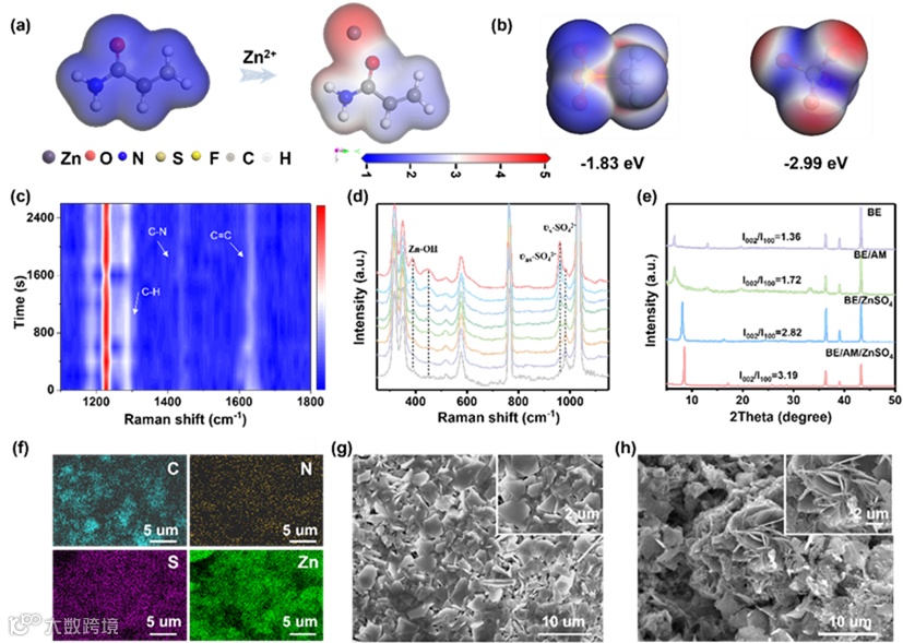 图2. 聚合物-无机杂化SEI形成机理。(a) AM分子静电势图;(b)Zn2+ 与SO42- 和 CF3SO3- 的结合能;(c-d) 锌沉积不同时间原位拉曼图谱;(e) 不同电解液中循环后锌阳极XRD对比图;(f) EDS能谱图;(g-h)有无SEI扫描电镜对比图。