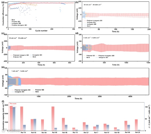 图4. 不同锌阳极沉积剥离行为对比。(a)库伦效率对比;(b-e)不同电流密度和容量下长时间循环性能对比图;(f)与目前报道的其他工作对比:累积容量和 J * C。