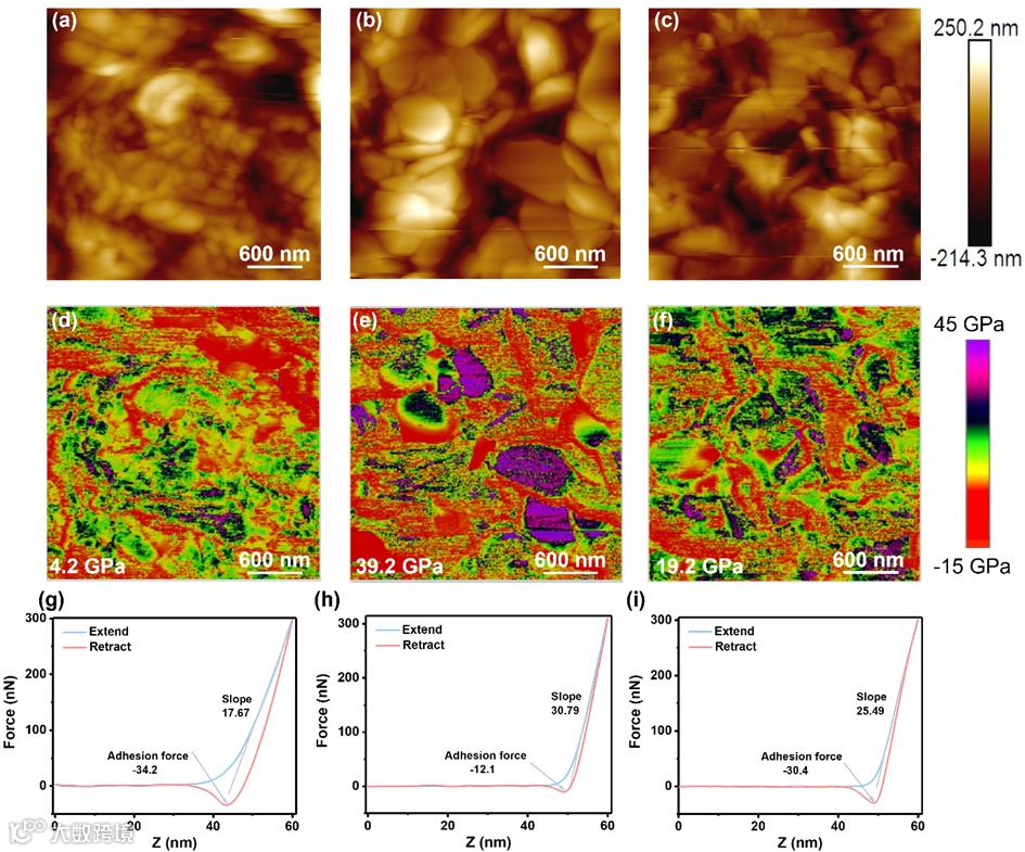 图5. 不同SEI的机械性质表征。(a, d, g) 聚合物SEI的AFM图,DMT模量图,和力谱图;(b, e, h) 无机SEI的AFM图,DMT模量图,和力谱图;(c, f, i)聚合物-无机杂化SEI的AFM图,DMT模量图,和力谱图。