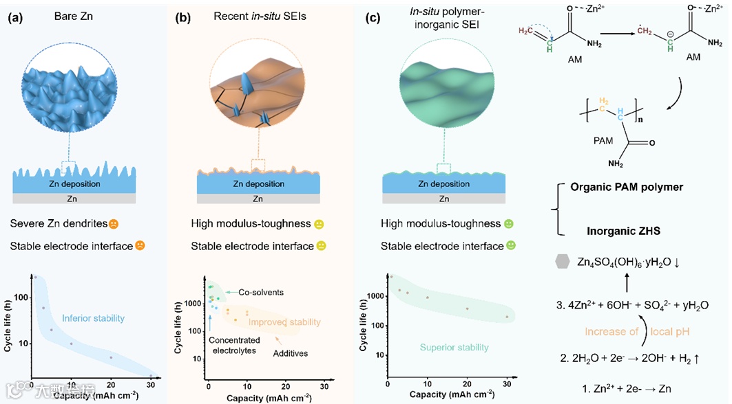 图1. 锌沉积对比示意图。(a) 无SEI; (b) 最近报道的SEI; (c) 聚合物-无机杂化SEI及形成机理图。